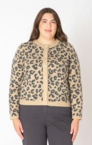 This beige cardigan brings wild energy into a refined silhouette. Featuring a classic crew neckline and soft, fuzzy texture, it’s punctuated by a bold leopard print in black and brown that adds instant attitude. The off-white buttons and ribbed trim keep things polished, while the cozy knit makes it perfect for layering. Pair it with structured trousers or a pleated skirt — it’s the kind of piece that plays nice with everything, but never fades into the background.