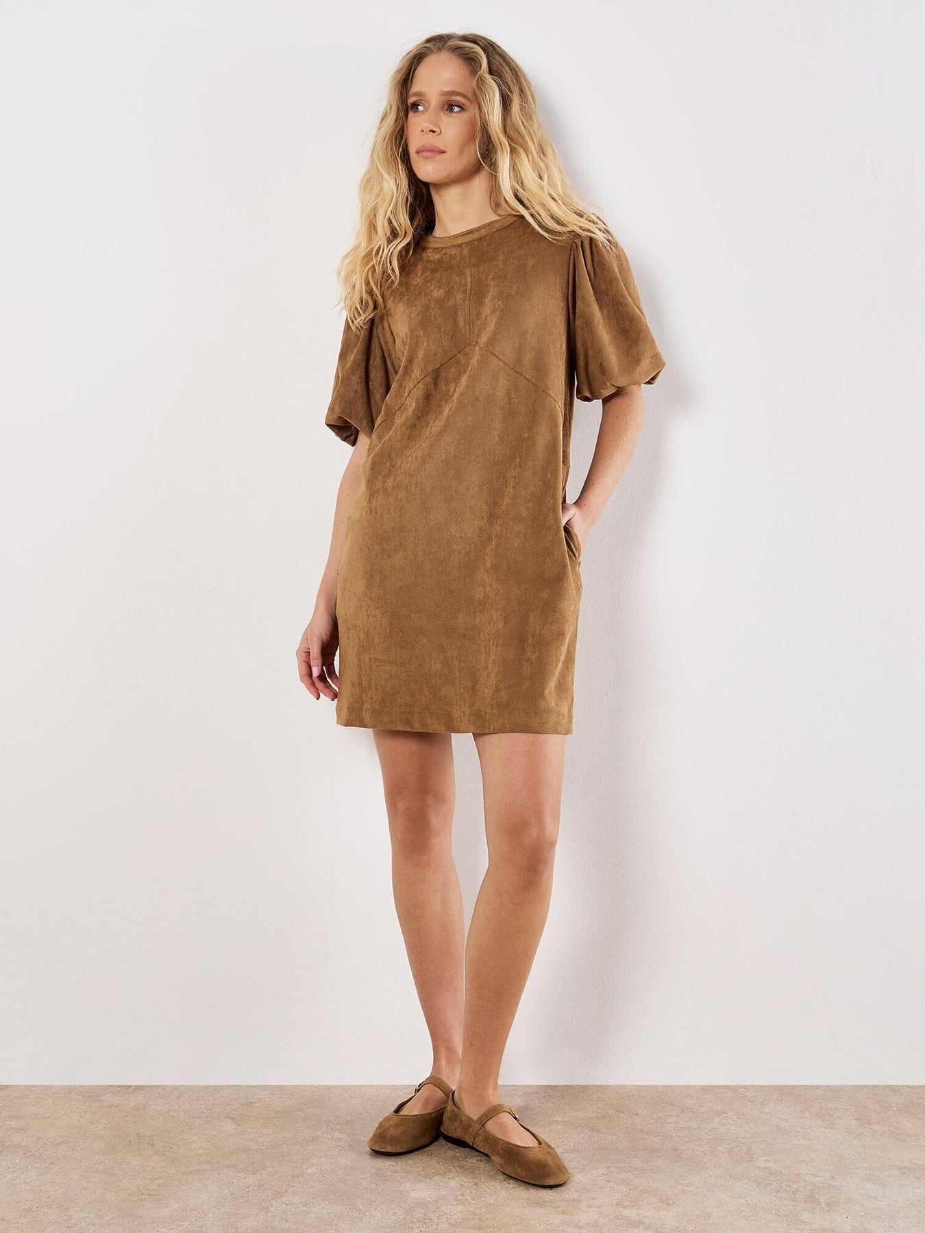 Effortlessly blend casual cool and retro styling with this suede mini dress. In a figure-skimming shift shape, it boasts voluminous puff sleeves, a keyhole fastening at the nape, and practical side seam pockets. Wear with cowboy boots for a festival-ready finish, and layer with a leather jacket when the temperature drops.