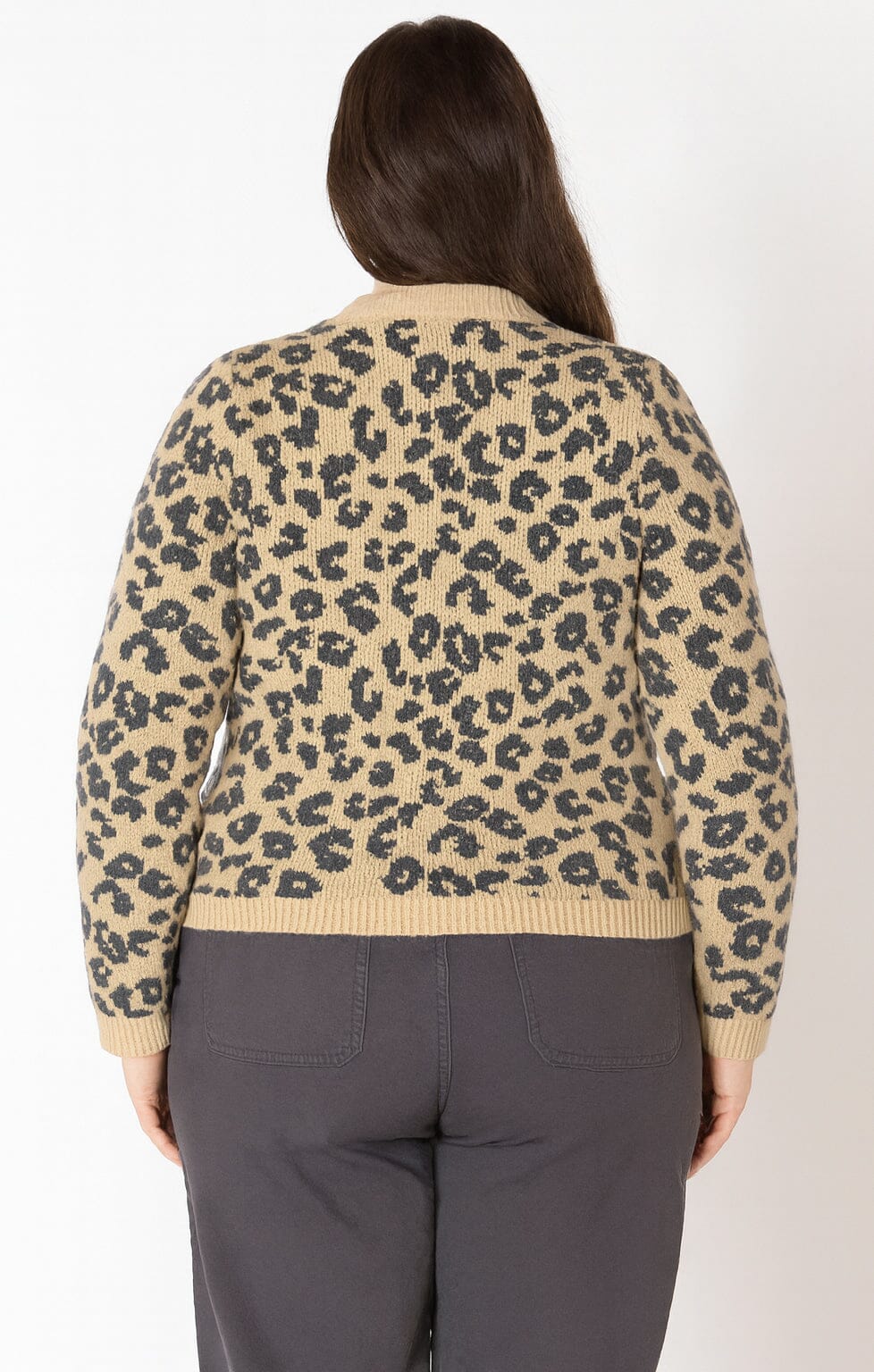 This beige cardigan brings wild energy into a refined silhouette. Featuring a classic crew neckline and soft, fuzzy texture, it’s punctuated by a bold leopard print in black and brown that adds instant attitude. The off-white buttons and ribbed trim keep things polished, while the cozy knit makes it perfect for layering. Pair it with structured trousers or a pleated skirt — it’s the kind of piece that plays nice with everything, but never fades into the background.