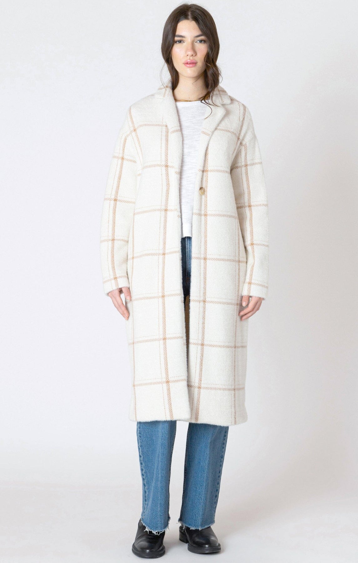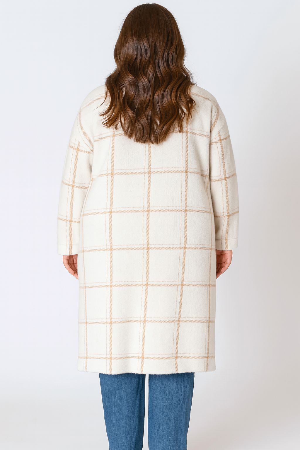 This cream-colored coat reimagines timeless tailoring with a soft, oversized silhouette and a subtle tan windowpane check. The notched lapel and single-button closure lend structure, while the textured wool blend offers warmth without weight. It’s the kind of outerwear that elevates denim and sneakers, yet feels right at home over a crisp dress or tailored trousers. Understated, versatile, and quietly confident — just like your best days.