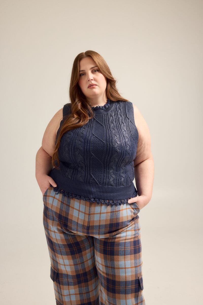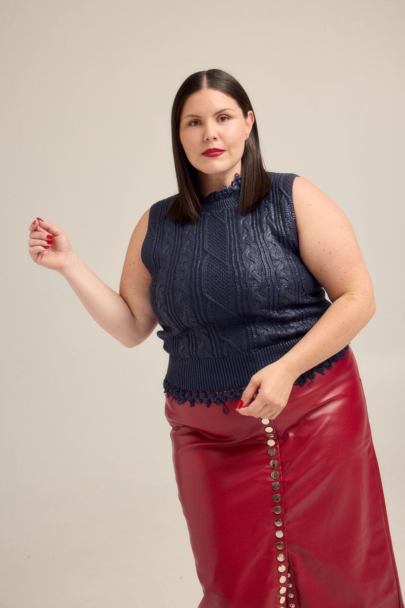 This sleeveless Navy sweater vest offers a sleek, fitted silhouette crafted from stretch knit fabric for comfortable wearing and is the perfect piece for fall layering. Its foil finish adds a subtle metallic sheen, elevating your outfit with a modern, polished touch. Ideal for versatile styling, it combines classic design with contemporary detail.