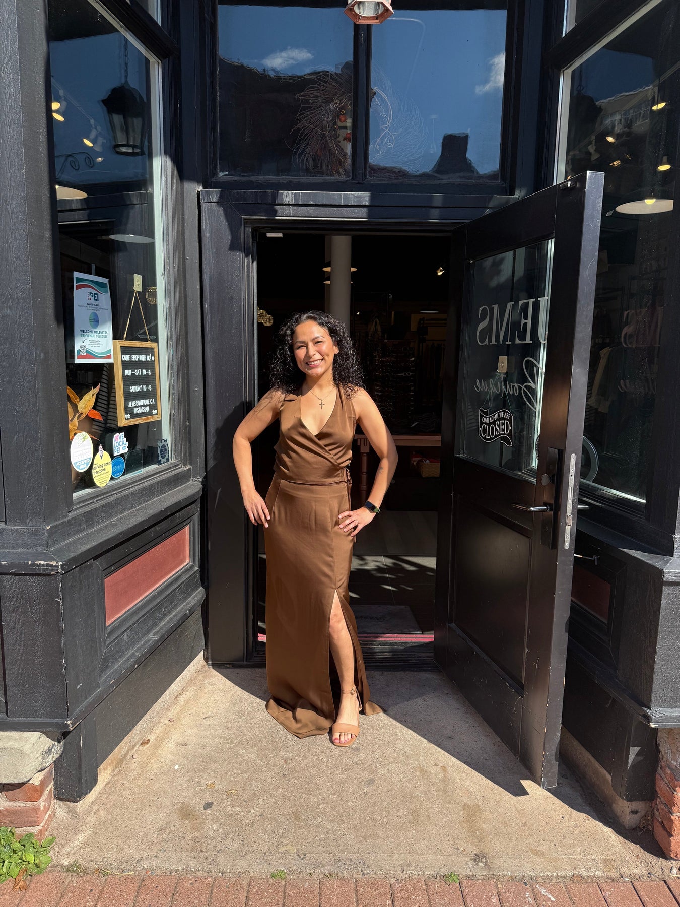 This halter wrap top boasts a flattering fit with a sultry v-neck, making it a versatile and stylish choice. The satin style has a faux front wrap with an open back has two elastic straps for comfort and support but adds a touch of intrigue, while the matching maxi skirt completes the look.